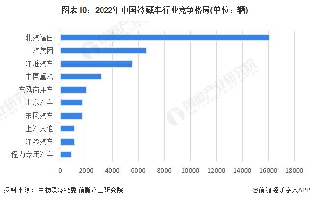 目前,我国冷藏车行业市场以北汽福田为主,2022年销量达1.6万辆,其次为一汽集团,冷藏车销量6618辆,仅为北汽福田的40%,江淮汽车销量5557辆。其余企业不足5000辆。