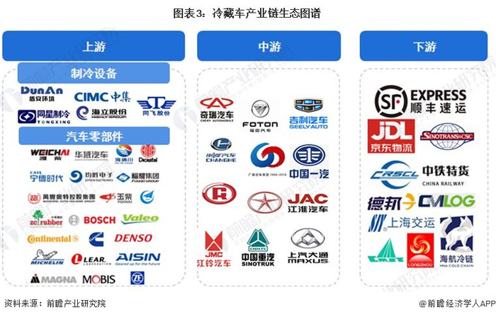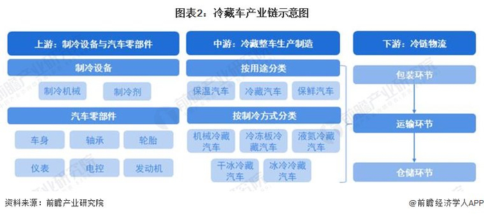 中国冷藏车产业的上游主要为制冷设备、汽车零部件等生产商;中游包括冷藏车生产等环节;下游则主要是冷链物流的运输环节。