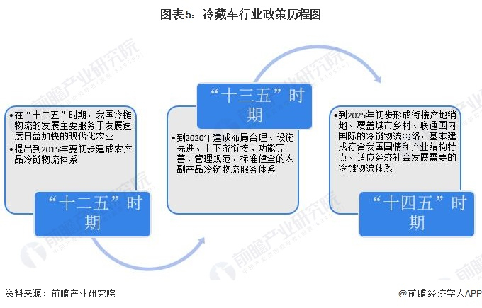 从国家层面的政策出台进程来看,我国国家层面的冷藏车相关指导性政策的出台时间相对较晚。随着我国现代化农业的不断发展,“十二五”以来,我国出台了冷链物流相关指导性政策,冷藏车作为冷链物流体系中的关键一环,其发展受到重视。