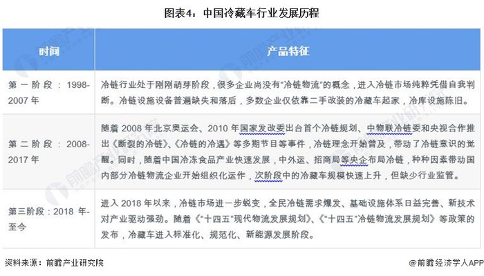 冷藏车的发展主要受益于冷链物流产业的发展。1998年以来,我国冷链物流进入萌芽阶段。如今将冷链物流体系日益完善,对我国冷藏车行业发展起到推动作用。我国冷藏车的发展主要经历以下三个阶段: