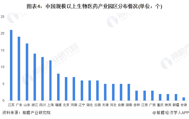 生物医药产业园区分布图:江苏、广东、山东位列前三