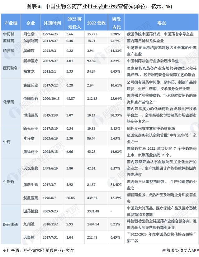 生物医药产业代表性企业经营情况