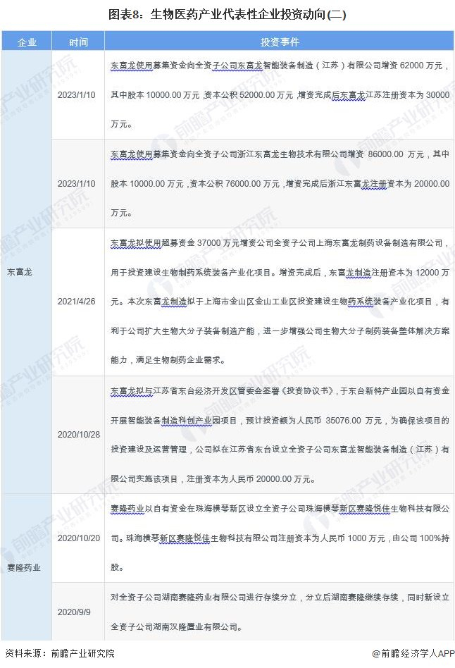 2020年以来,生物医药产业代表性企业的投资动向主要包括收购公司拓展业务、通过对子公司增资的方式扩大业务等。生物医药产业代表性企业最新投资动向如下: