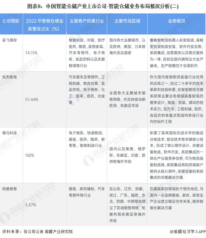 在智能仓储行业上市公司中,德马科技、音飞存储的智能仓储业务占比较高;在具体业务布局方面,大部分企业的业务类型较为广泛,客户类型较多,企业抗单一市场波动的风险较强;在区域布局方面,大部分企业除了深耕国内市场外,均已成功开拓海外市场,以东南亚、欧美地区为主。