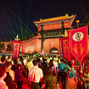 “落吊桥,开城门,迎贵宾。”晚上8点半,西安城墙景区灯火璀璨,《梦长安—大唐迎宾盛礼》行进式演出拉开帷幕。来自北京的田先生感慨:“非常震撼,和演员一起越过永宁门,仿佛穿越回大唐盛世。”