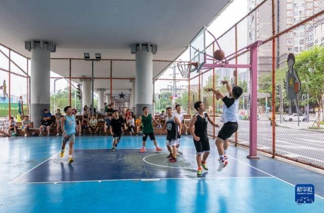 人们在成都市府青路立交桥下的运动空间打篮球(2022年6月12日摄)。