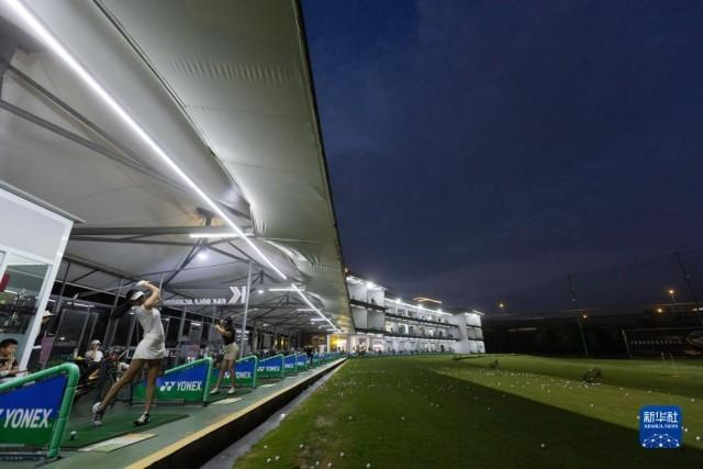 高尔夫球爱好者在成都新阵地高尔夫练习场练习(7月18日摄)。