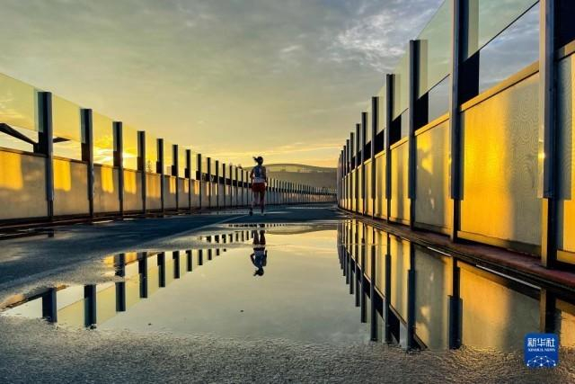 市民在成都锦城湖公园的绿道上晨跑(2021年7月17日摄)。