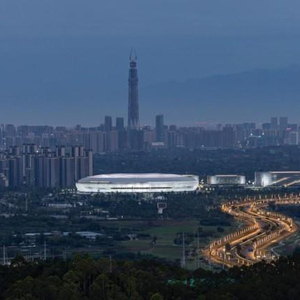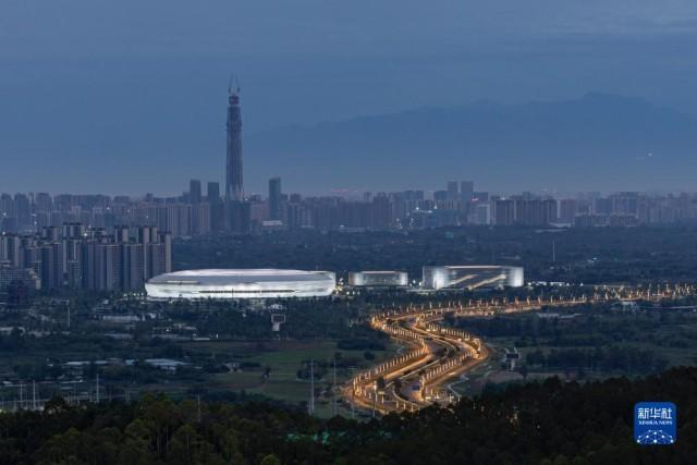 这是从成都龙泉山方向拍摄的东安湖体育公园(7月4日摄)。