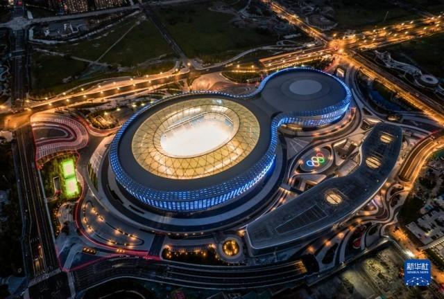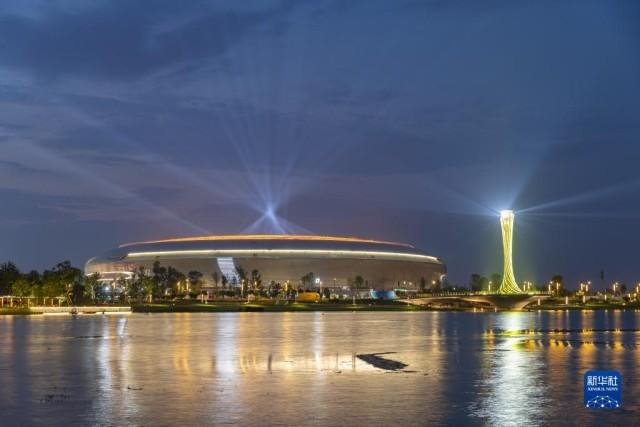 这是在成都市龙泉驿区拍摄的夜幕下的东安湖体育公园(7月18日摄)。