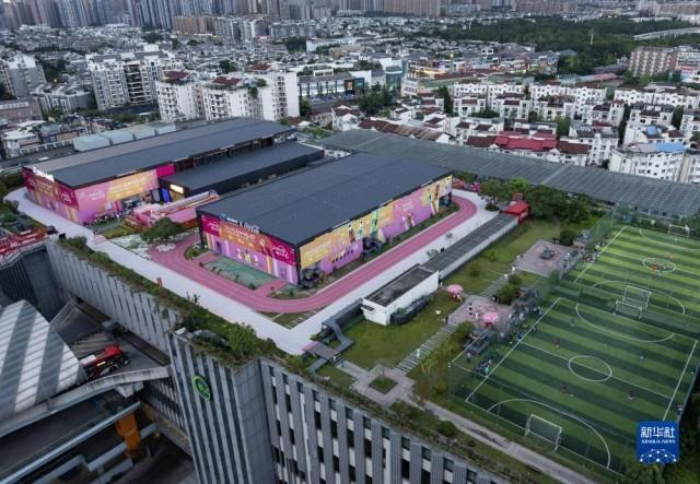 这是成都西村大院楼顶跑道及足球场(2016年5月28日摄,无人机照片)。