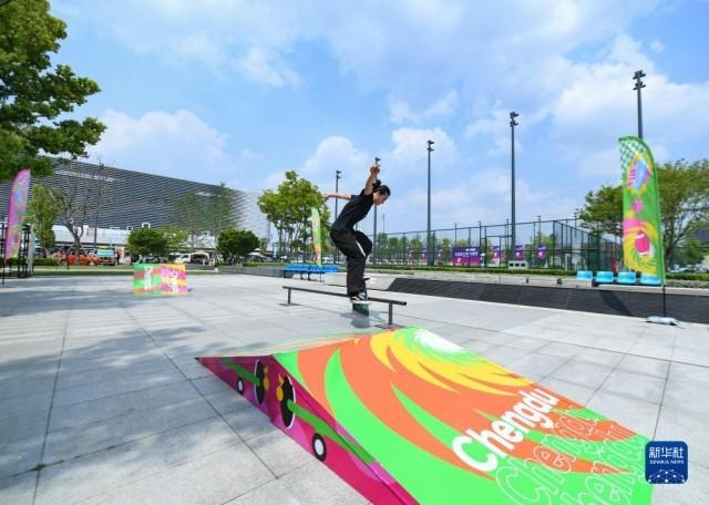 滑板爱好者在成都东安湖体育公园练习滑板(4月19日摄)。