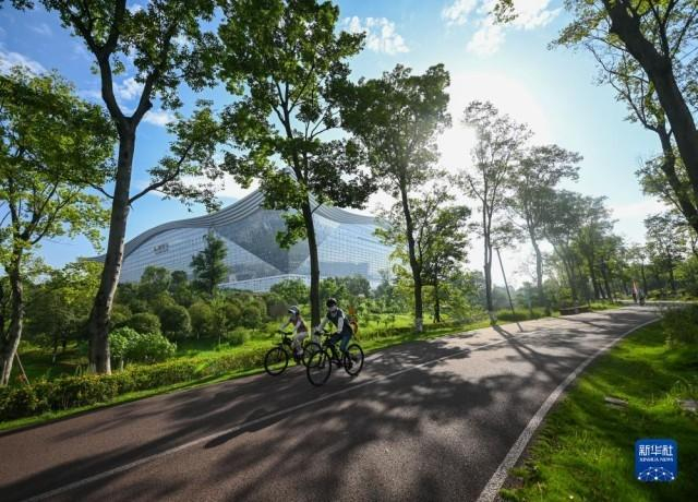人们在成都锦城湖公园绿道上骑行(6月25日摄)。