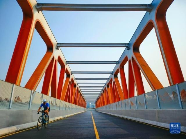 人们在成都锦城湖附近的绿道骑行(6月25日摄)。