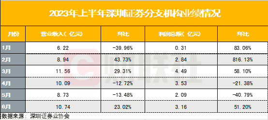 2022年券商业绩备受行情拖累,进入2023年,“难上加难”更成为真实写照,深圳分支机构半年度经营成绩单同样如此,虽然有6月的业绩改善,但1-6月仍属下滑状态。实现营业收入56.28亿元,较上年下滑13.87%;利润总额为16.42亿元,同比下滑20.14%。