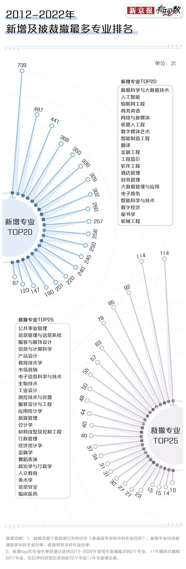 近十年的高校裁撤专业TOP25里可以看到,除了公共事业管理,信息管理与信息系统专业也被裁撤了114次,和公共事业管理专业并列第一,其次,服装与服饰设计和信息与计算科学也分别被裁撤了92次和85次,排在第三、第四位。与之相对的,是数据科学与大数据技术、人工智能等新兴专业成为热门。就说现在,网购、行程码、就医……人们的生活越来越数据化、智能化,这也促进数据智能产业势必会成为热门行业。高校本科专业增设、调整与消亡的背后,与社会发展息息相关,也反映了高校与政府及区域社会之间持续了几十年的沟通与协调。总而言之,专业设置盲目扩张、粗放发展的阶段正慢慢地过去,教育相关部门拥抱变化,随着我国高校的专业设置上的自主权逐步放大,未来的学科将更服务于产业,更回归理性。读着读着,我的专业就没了