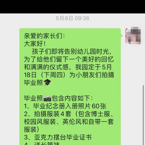 徐女士的儿子就读于重庆渝北区黄泥磅金秋十月幼儿园,今年5月,她所在的家长群里收到了园方发来的一则通知,园方将请专业机构来为小朋友们拍摄毕业照。包括:毕业纪念册入册照片60张;拍摄服装4套(包含博士服、校园风服装、英伦风和自带一套服装);亚克力摆台毕业证书;送长筒袜……费用共计288元/套。并在群里开启了接龙。