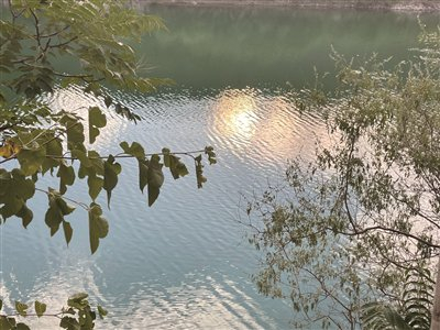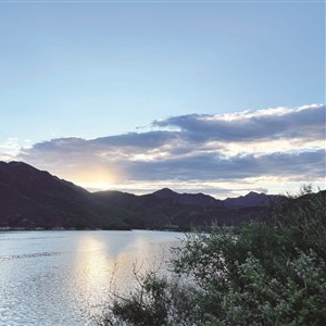 在水库大坝的边上,开辟了一条登山小道,站在高处,正好可以眺望水库全貌,于是,我们几个叉着腰登高望远,周边非常寂静,落霞撒落在水面,水鸟掠波而过,青山无言,响潭有声,“落霞与孤鹜齐飞,秋水共长天一色”,王勃当年目睹的奇景,就这样呈现在我们的眼前。大时代给了我们静心品赏美景的机会,大自然赐予我们这奇山异水,此情此景,岂能无诗,于是做绝句以纪之: