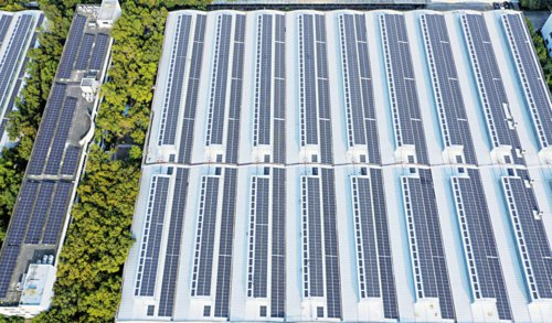 日立电梯在生产管理中积极推进绿色低碳运营方式,在中国的5家工厂完成了屋顶光伏发电系统建设。图为位于广州番禺的日立电梯大石工厂的屋顶光伏。黄剑超/摄