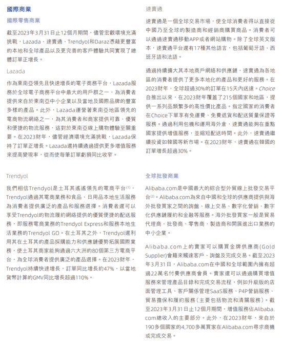 在海外,阿里国际数字商业集团则通过丰富的本地和全球商品和完善的消费体验,服务数亿海外消费者,并触达来自全球超过4700万名活跃中小企业买家。坚持为中小商家和消费者创造价值,推动Lazada、速卖通、Trendyol和Daraz等业务在2023财年实现了总体订单正增长。