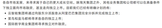 张勇在致股东信中表示:“除淘天集团之外,其他业务集团和公司都可以在具备条件下独立面向市场融资,甚至走向独立上市。目前我们已经有明确计划的有:云智能集团将通过向股东分派股息从阿里巴巴集团完全分拆并完成独立上市;菜鸟和盒马都将寻求各自的独立上市;国际数字商业集团将寻求独立对外融资。”