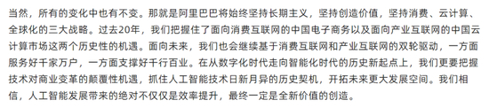 张勇在致股东信中表示:“当然,所有的变化中也有不变。那就是阿里巴巴将始终坚持长期主义,坚持创造价值,坚持消费、云计算、全球化的三大战略。过去20年,我们把握住了面向消费互联网的中国电子商务以及面向产业互联网的中国云计算市场这两个历史性的机遇。面向未来,我们也会继续基于消费互联网和产业互联网的双轮驱动,一方面服务好千家万户,一方面支撑好千行百业。在从数字化时代走向智能化时代的历史新起点上,我们更要把握技术对商业变革的颠覆性机遇,抓住人工智能技术日新月异的历史契机,开拓未来更大发展空间。我们相信,人工智能发展带来的绝对不仅仅是效率提升,最终一定是全新价值的创造。”