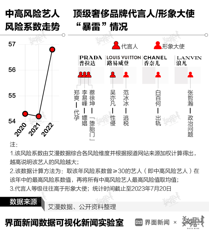 艾漫数据显示,中高风险艺人的整体风险系数呈上升趋势。多家顶级奢侈品牌都已经历过合作艺人的“暴雷”事件,如与郑爽、李易峰、蔡徐坤签下代言的普拉达就曾有“代言人魔咒”之称,香奈儿、路易威登等品牌也都未能幸免。