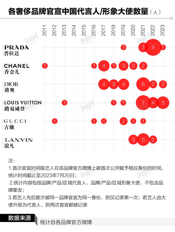 从前能够代言顶级奢侈品牌的中国艺人屈指可数,且多为周迅、李冰冰等实力派演员;但在2016年前后,随着中国社交媒体的发展与流量明星的涌现,多个顶奢品牌走上与流量明星合作的道路,中国代言人/形象大使的数量随之激增。
