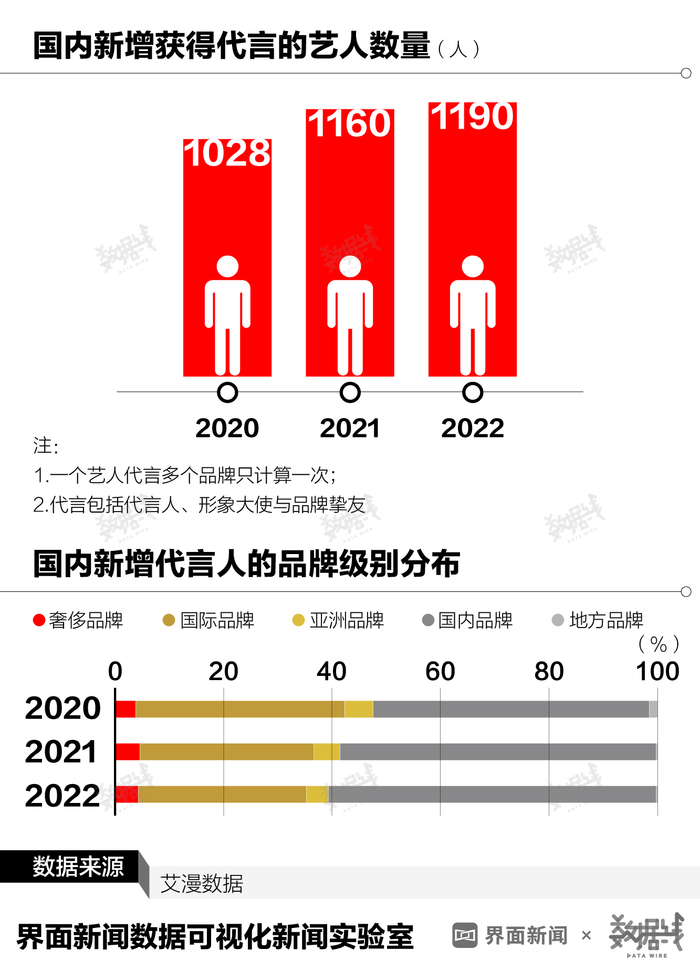 艾漫数据显示,近年新增的获得品牌代言的艺人数量呈上升趋势,2022年新增1190人,为近年来最多。不过奢侈品代言在所有新增代言中的占比仅有4%,其对代言人的要求也更为苛刻,顶级奢侈品代言在所有代言中更是属于“顶端的存在”。