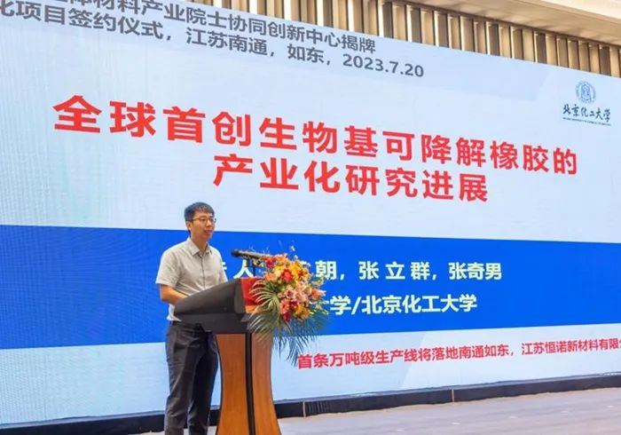 在7月20日举行的江苏绿色弹性体材料产业院士协同创新中心揭牌暨产业化项目签约仪式上,全球首个11万吨生物基可降解聚酯橡胶产业化项目正式签约,我国在原创橡胶材料领域步入新阶段。
