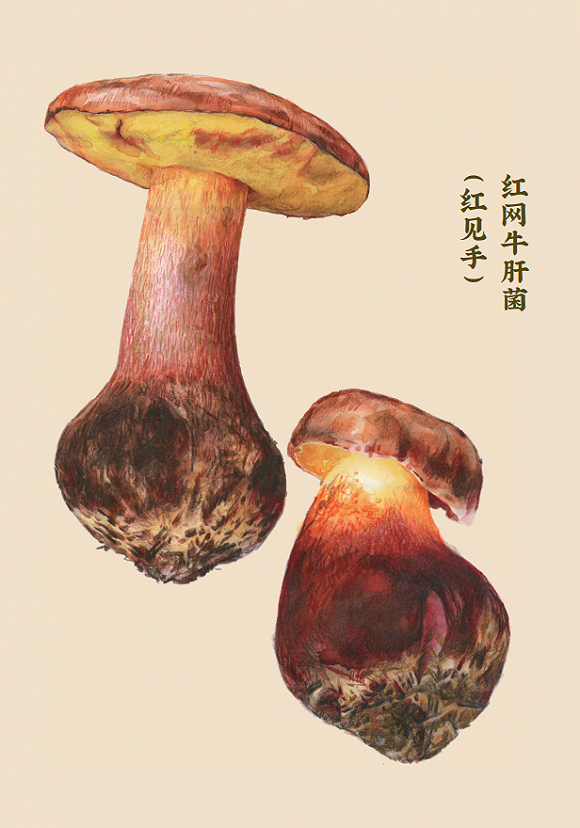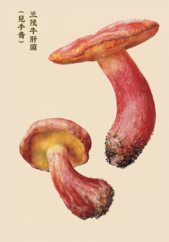 牛肝菌家族中每年率先登场的见手青有一个非常好听的学名——兰茂牛肝菌,是以云南明代医学家兰茂命名的,牛肝菌一词也是出自兰茂的《滇南本草》。因为牛肝菌有着特别丰富的色彩,整个菌菇呈一种特殊的红黄相间的颜色,所以民间也有叫它红牛肝菌、红葱、红见手的。这种菌的菌盖鳞片部分通常为紫红色或深玫瑰红色,菌褶部分是好看的黄色,在菌柄部分靠近菌盖之处,会呈黄色及橄榄色调。见手青表面有种绒绒的质感,碰到潮湿时会有点黏。它具备毒蘑菇的色彩特征,在烹饪制作过程中,洗干净后切片的时候,只要被手触摸到,切好的菌片就会马上从黄色变成蓝青色,所以民间就很形象地称之为见手青。外地人看到这个颜色的蘑菇一般不太敢动吃的念头。