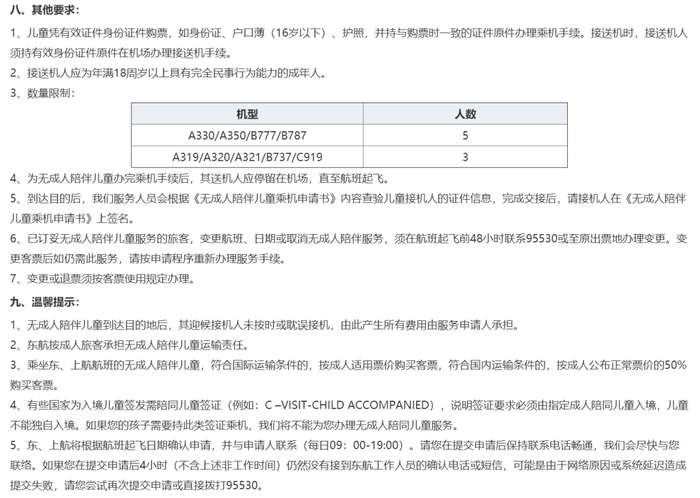 数量限制:年满5周岁未满8周岁的无成人陪伴儿童每个航班限制承运5人,8周岁(含生日当天)以上无数量限制。