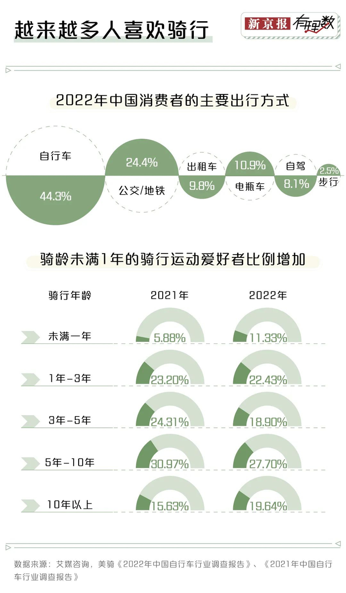 《2022年中国自行车行业调查报告》数据显示,在骑行爱好者中,骑龄未满1年的骑友从2021年的5.88%增长至11.33%,这意味着,有更多新手玩家加入骑行队伍。