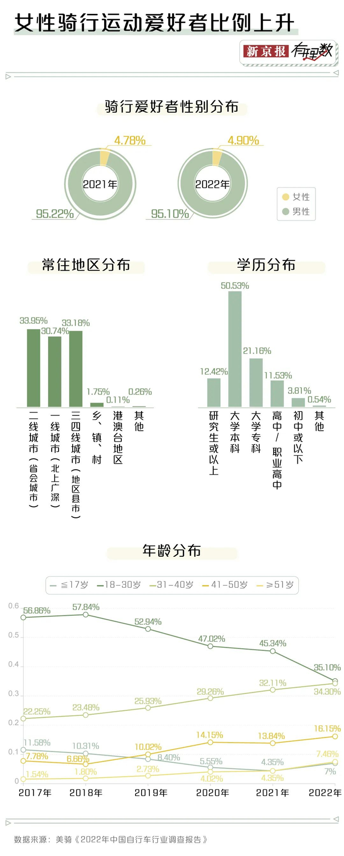 数据显示,30岁左右、一二线城市、高学历是骑行爱好者的典型特征,从性别比例看,骑行领域依然是男性用户占据压倒性的绝对多数,但女性用户占比也在逐年增长,目前占比超过4.9%,而在2019年疫情之前,女性车友的占比是3.82%。