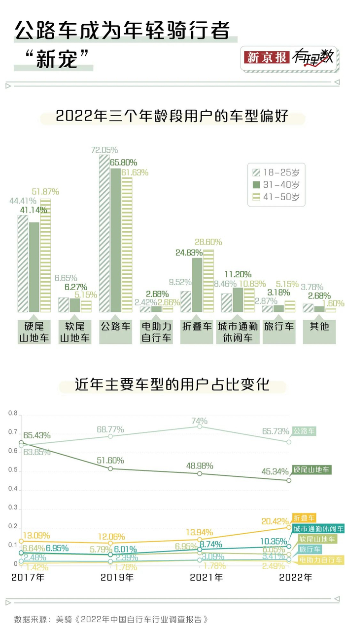 根据相关机构的调研显示,从近几年骑行爱好者拥有车型看,硬尾山地车拥有率持续下降,公路车在多年增长之后首次下滑。与此同时,最近两年越来越多人选择骑车通勤,所以休闲车款备受大众青睐,体现在数据调查结果上,即折叠车与城市休闲车增幅较往年更加明显。