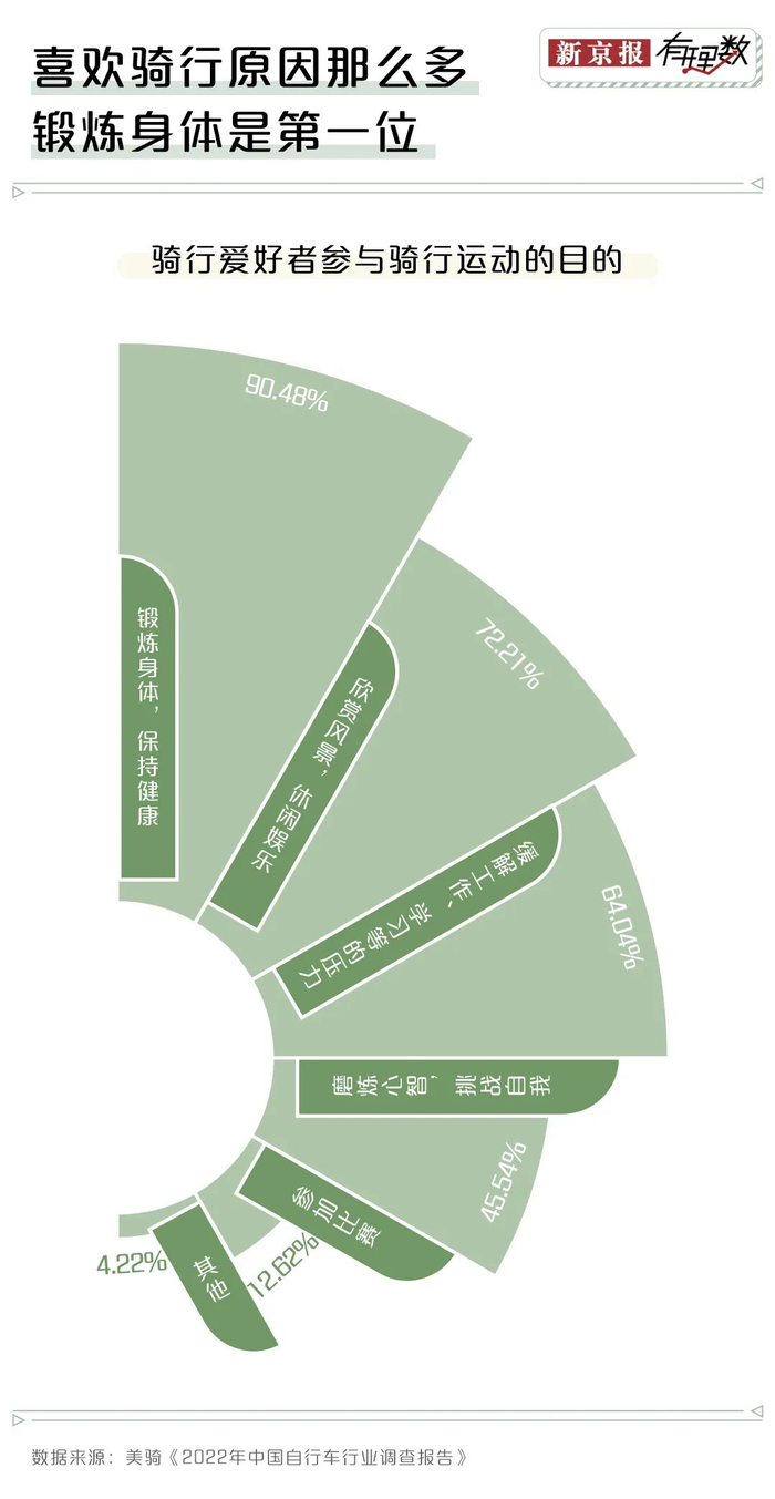 骑行的功能性强,不仅可以是代步工具,也可以锻炼身体、保护环境。虽然很多人是因为通勤需求接触到骑行,但在大多数骑行爱好者心目中,锻炼身体是喜欢骑行的第一因素。