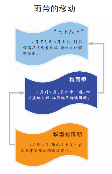 其实,“有形”的雨带,与一个常年影响我国天气的天气系统——副热带高压有关。副热带高压内部盛行下沉气流,空气干燥炎热,如同一个大蒸笼扣在地面上。但在副热带高压的边缘地区,却盛行上升气流,这是形成降雨的必要条件之一。雨带会随着副热带高压的季节性移动而摆动。