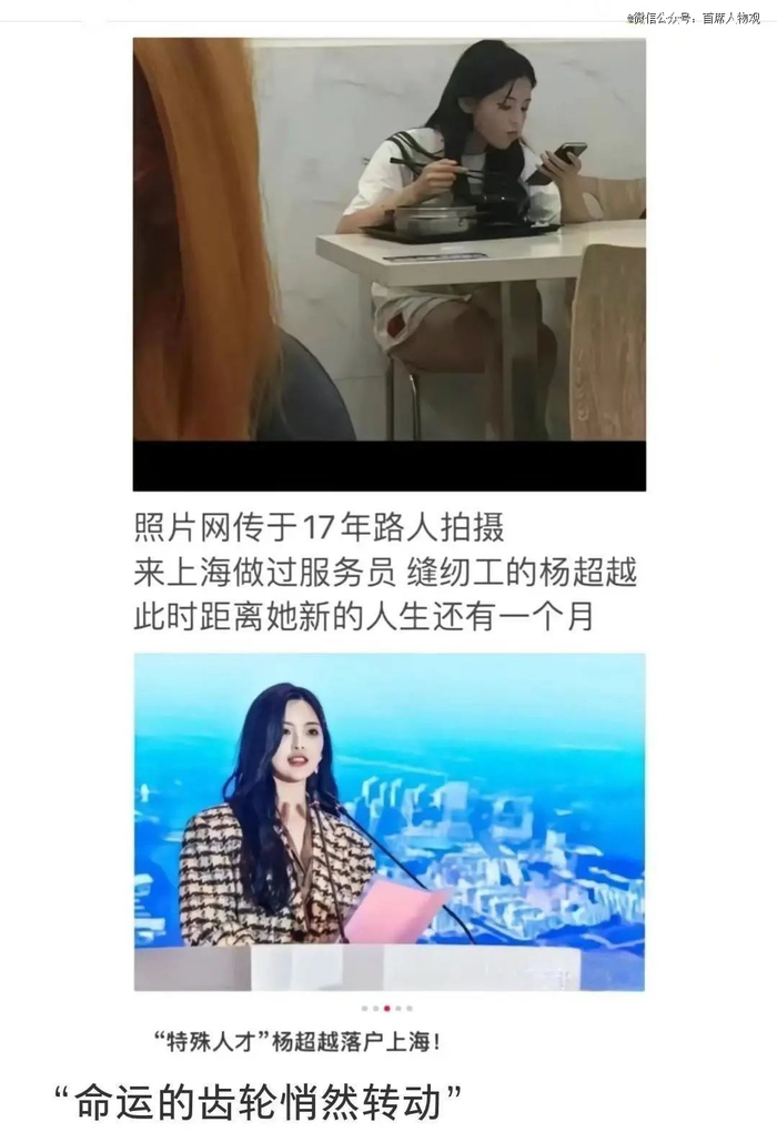 比如,有人放出了杨超越2017年在沙县小吃吃面的照片,写道,“来上海做过服务员、缝纫工的杨超越,此时距离她新的人生还有一个月”。作为对比的照片是,她在2020年作为上海市临港新片区入驻的企业代表在台上发言。