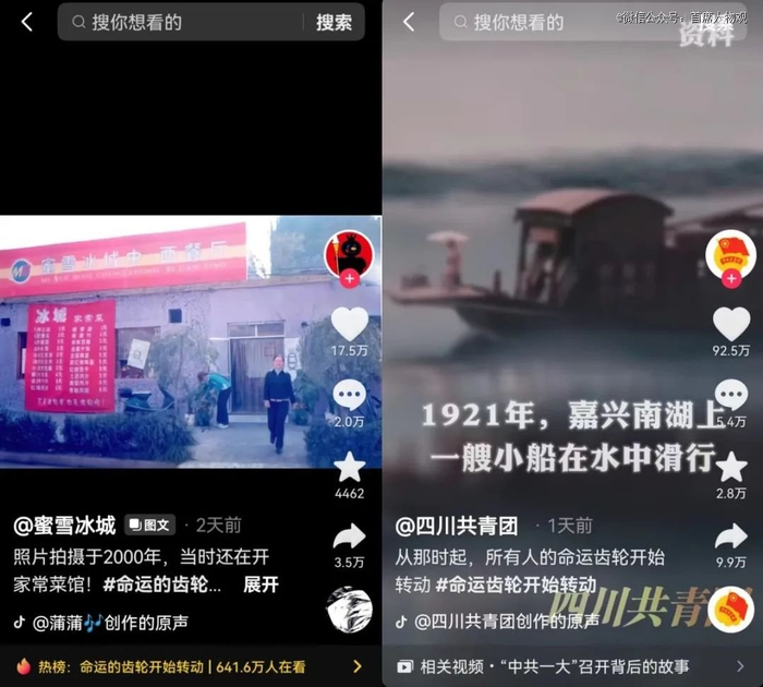 连官方账号也加入其中。三一集团、蜜雪冰城、桃李面包等企业也紧跟这股潮流宣传了一波自己的历史,甚至四川共青团也参与进来,一出手就是“这个系列的天花板”:从1921年浙江嘉兴南湖上的那艘小船开始,所有人命运的齿轮开始转动。这个将话题提升到新高度的视频,目前已经获赞超过90万。