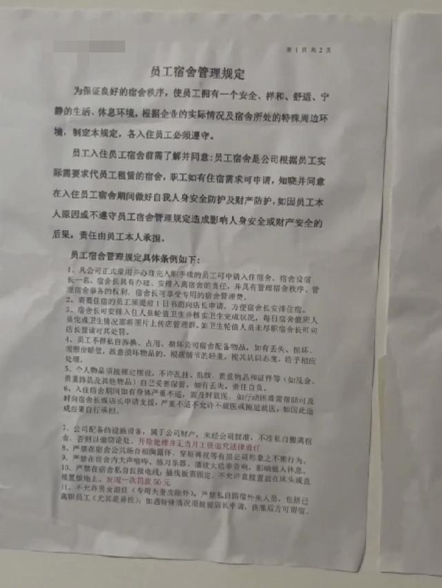 据了解,该房屋的承租人是附近一家餐饮店老板,而这间两室一厅的屋子正是为员工准备的宿舍,在房间的墙上还贴着一张“员工宿舍管理条例”。