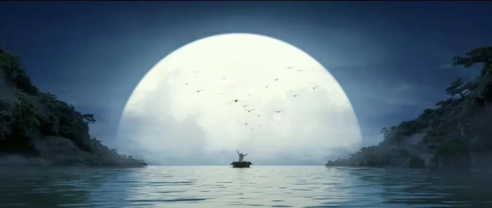 在水波涟漪中,在星河灿烂中,在玉宇琼楼中,鲸鱼翻跃半空,真实与幻境交织,清醒和陶醉交错,想象力不羁奔放,穿越时空的界限。“谪仙人”带着观众一起在梦幻的旅程中徜徉,我们的所有感官都被充分打开,心和情都融入了这诗篇当中,为之震撼不已。中国人独有的“浪漫”挥洒得淋漓尽致。