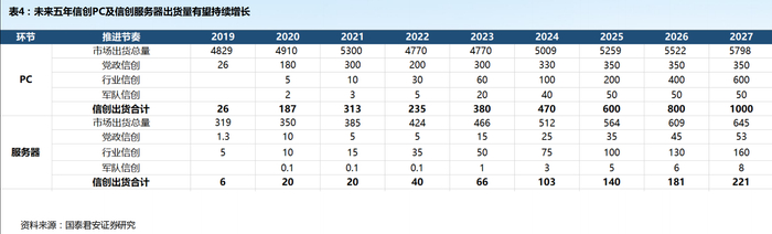 国泰君安李沐华等人在6月22日发布的研报中表示,预计在政策驱动下,信创PC及信创服务器的出货量将从2023年开始启动一轮长达五年的黄金增长期,从而带动各环节国产软硬件市场需求的持续增长。