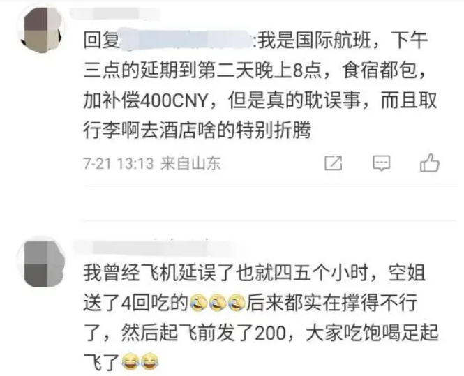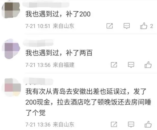 不少网友表示,也遇到过类似情况。“发了200元现金,拉去酒店吃了顿饭还去房间睡了个觉。”“食宿都包,加补偿400元,但是真的耽误事。”“空姐送了4回吃的,然后起飞发了200元”。