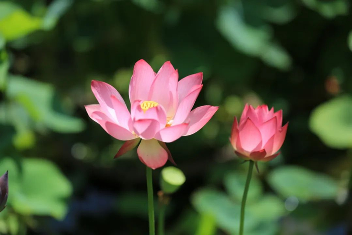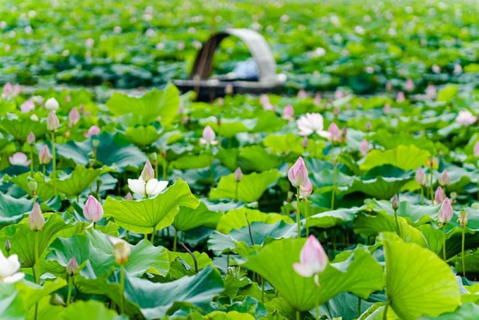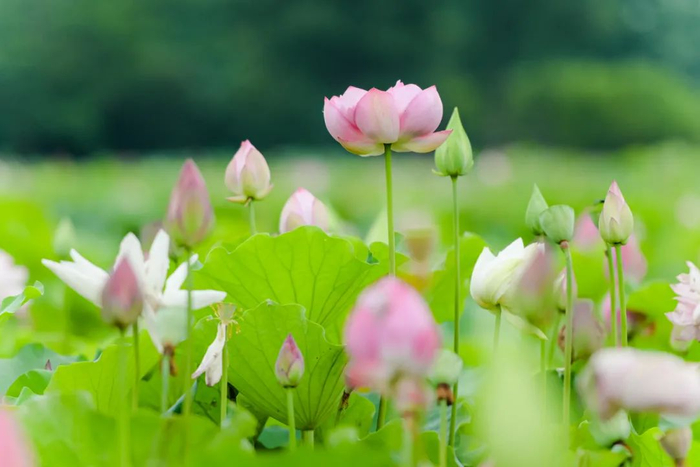 荷叶如盖,团团簇簇,层层叠叠,迎风招展,遮住了水面,高低错落间,朵朵荷花,姿态各异,明丽娇艳,焕发出勃勃生机。看着眼前这竞相绽放的荷花,会让人忘掉暑热的烦恼,心生丝丝凉意。