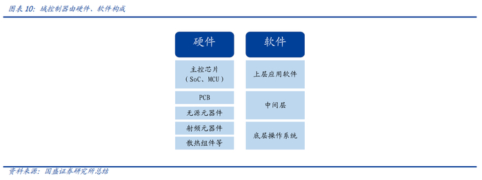 域控制器主要由硬件(主控芯片和元器件等)和软件(底层基础软件、中间件以及上层应用算法)构成,其功能的实现主要来自于主控芯片、软件操作系统及中间件、应用算法软件等多层次软硬件之间的有机结合。