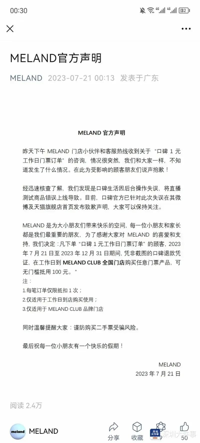 20日下午MELAND门店和客服热线收到关于“口碑1元工作日门票订单”的咨询,情况很突然,“和大家一样,不知道发生了什么情况”
