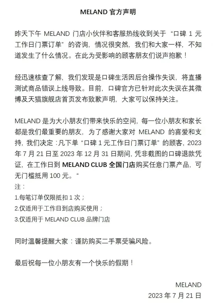 在表达歉意的同时,MELAND表示,凡下单“口碑1元工作日门票订单”的顾客,7月21日至12月31日凭非截图的口碑退款凭证,在工作日到MELAND CLUB全国门店购买任意门票产品,可无门槛抵用100元。