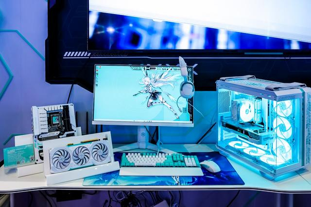 作为ROG展区的颜值巅峰,ROG吹雪区显然是参展玩家们的必逛点位!这里不仅有吹雪姬COSER小姐姐与玩家们亲切合影打卡,还可以一览ROG吹雪全家桶的真容!ROG吹雪全家桶采用华硕ROG STRIX RTX4080 O16G WHITE白色版显卡,外观采用了冰雪主题的白色主色调,纯白的金属外壳和耀眼的ROG logo,让这一代显卡颜值来到了新的高度。