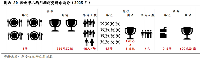 根据前文推算,截至2025年徐州市白酒市场规模将达到68亿左右,假设徐州市常住人口 2022-2025年人口保持基本平稳(过去5年常住人口CAGR为0.1%),对应人均饮酒量为1325元。考虑宴席、聚饮、商务三个消费场景的变化情况,做如下分析:①宴席场次和人数无明显变化,但宴席用酒价格伴随消费升级有所提升,幅度和收入增速基本一致,高于CPI增速;②聚饮场次和人数无明显变化,但聚饮用酒价格伴随消费升级有所提升,由于“面子”属性较弱且自饮等场景更加追求性价比,增速应小于宴席用酒价格增幅,同时由于徐州基数较低,复合增速应高于南京/苏州;③商务用酒方面,考虑到徐州市商业活动相对苏南地区欠发达,仍旧较大进步空间,因此,预计未来在商务频次上有所提升,同时考虑600元价格带对于当地宴席及自饮场景已经较高,因此预计未来商务用酒档次基本稳定。相对应对2025年徐州市人均年饮白酒量做以下假设拆分: