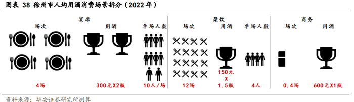 白酒价格带相对更低,饮酒文化受北方影响大。徐州地处苏北,经济实力与商务活动活跃度相对苏南、苏中落后,白酒消费结构也因此相对更低。但徐州毗邻山东、河南、皖北等饮酒重镇,因此在饮食习惯、酒桌文化、民风习俗等方面更加兼具北方特质,人均饮酒量更大、度数也相对更高(通常在46度以上)。因此,在考虑白酒三大消费场景宴席、聚饮、商务的假设拆分时,我们在用酒价格、单场用酒瓶数、商务活动频次等假设上注重与苏南的差别,2022年徐州市人均年饮白酒量假设拆分如下: